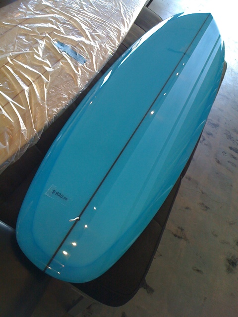 6’7″ HPH speedster, deep aqua tail dip w/ smoke stripe, Geppy keels, polished gloss